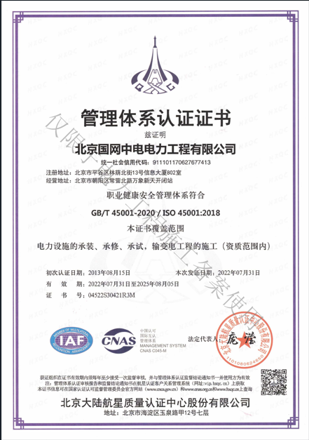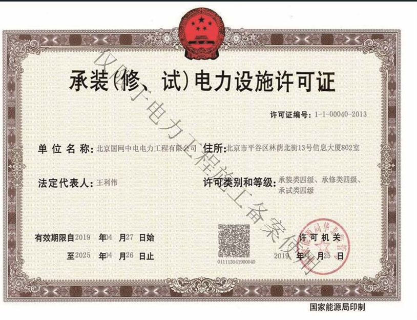 北京國網(wǎng)中電電力工程有限公司,已取得國家電監(jiān)會頒發(fā)的《承裝(修、試)電力設(shè)施許可證》、為電力施工承裝四級、承修四級、承試四級企業(yè)。北京市住房和城鄉(xiāng)建設(shè)委員會頒發(fā)的房屋建筑施工總承包二級、機電設(shè)備安裝工程專業(yè)承包二級、輸變電專業(yè)承包二級、城市及道路照明工程專業(yè)承包二級、市政公用工程總承包二級資質(zhì)、勞務(wù)不分等級,已通過ISO9001:2015 GB/T50430-2017質(zhì)量管理體系、GB/T24001-2016/ISO 14001:2015環(huán)境管理體系、